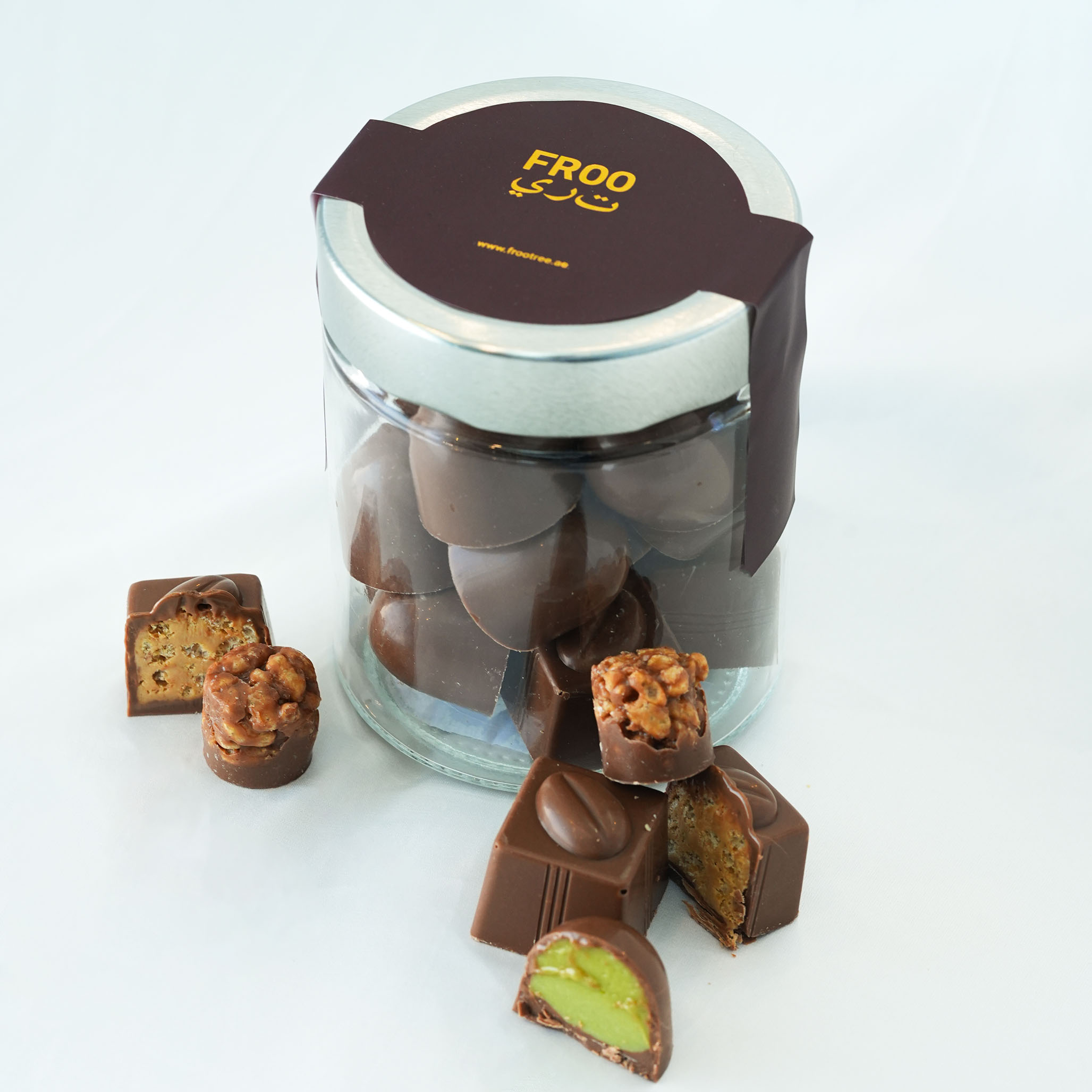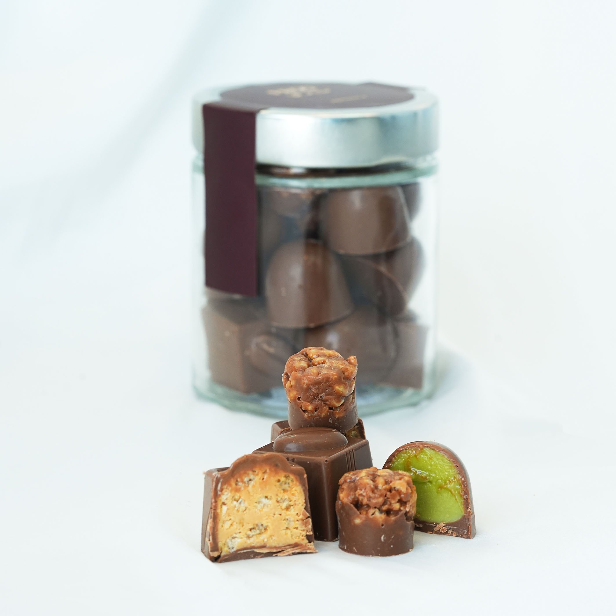 Discover our luxurious 250g Chocolate jar, beautifully arranged with milk chocolates. Each piece is crafted for rich taste and exquisite presentation, perfect for gifting or treating yourself. Elegant, round-shaped, and irresistibly delicious —every bite is a celebration of chocolate bliss.