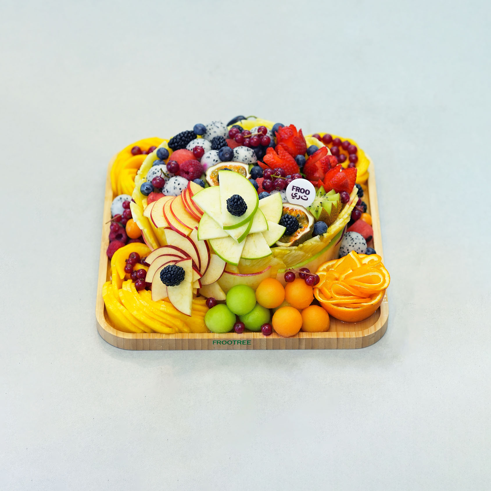 | A fruit platter featuring a mix of fruits including, melon, grapes,orange, rasberry, apple and other seasonal fruits beautifully arranged in a tray . Some fruits may be replaced by others depending on seasonal availability. |