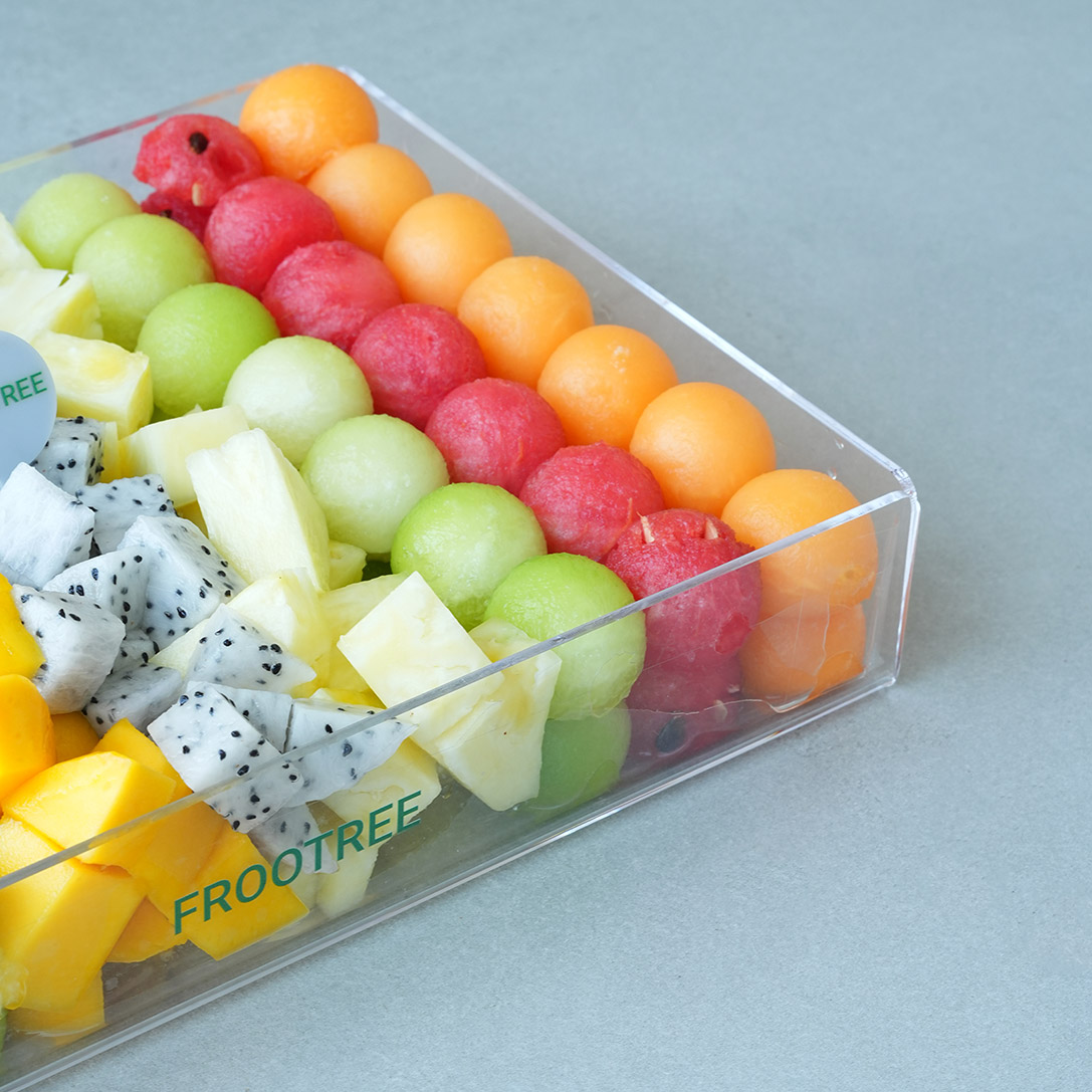 A fruit platter featuring a mix of fruits including Watermelon, melons, mango, dragon fruit, pineapple and other seasonal fruits — beautifully arranged in a tray (30*20 cm). Some fruits may be replaced by others depending on seasonal availability.