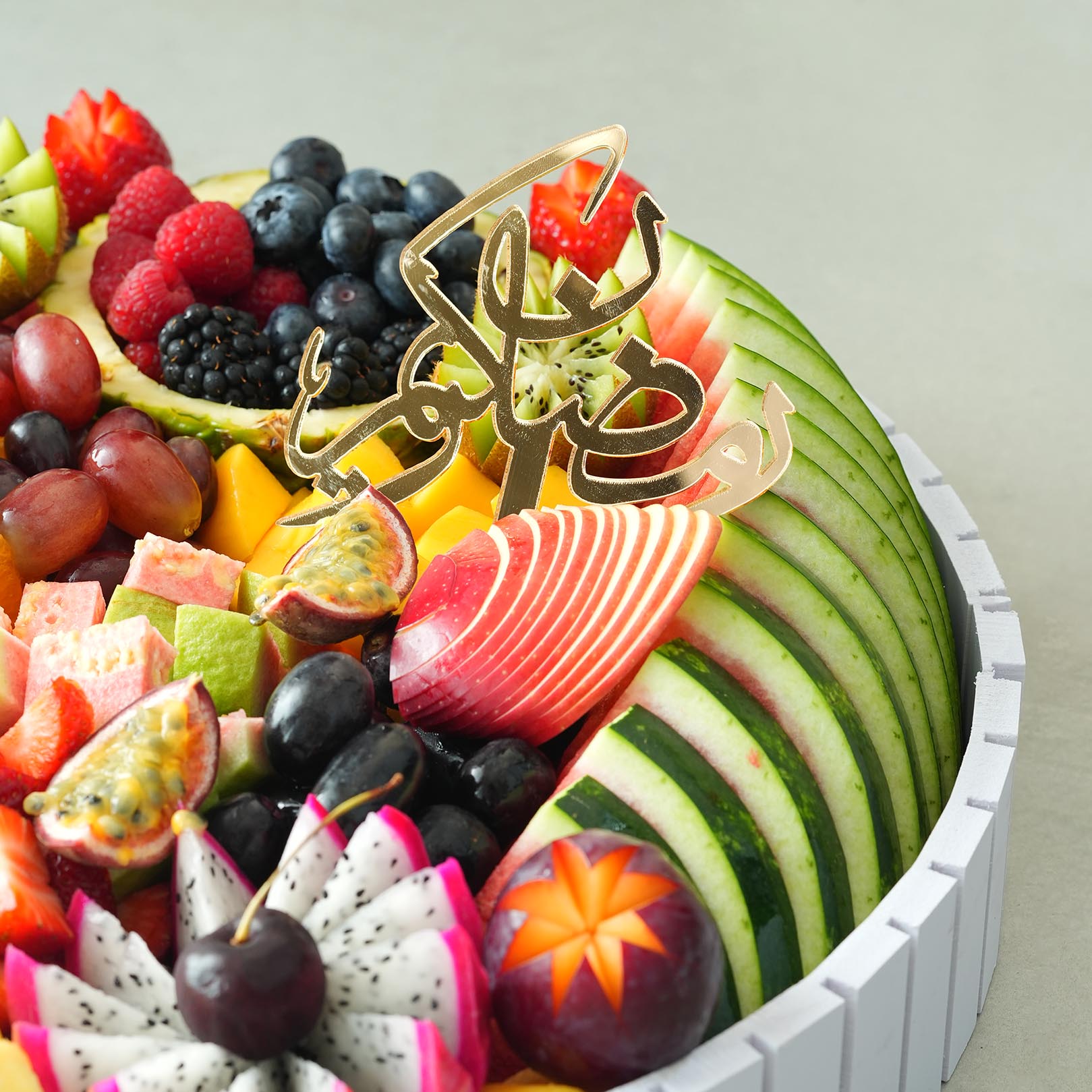 | A fruit platter featuring a mix of fruits including grapes, watermelon pineapple,mango, strawberry and other seasonal fruits — beautifully arranged in a 3 tray(38cm). Some fruits may be replaced by others depending on seasonal availability. |