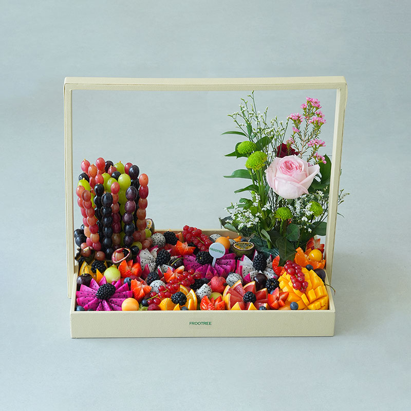 A fruit platter featuring a mix of fruits including grapes, watermelon, blueberries, strawberries, dragon fruit, golden berries, Mango,raspberry, passionfruit, and other seasonal fruits and some flowers — beautifully arranged in a Leather Basket. Some fruits may be replaced by others depending on seasonal availability.