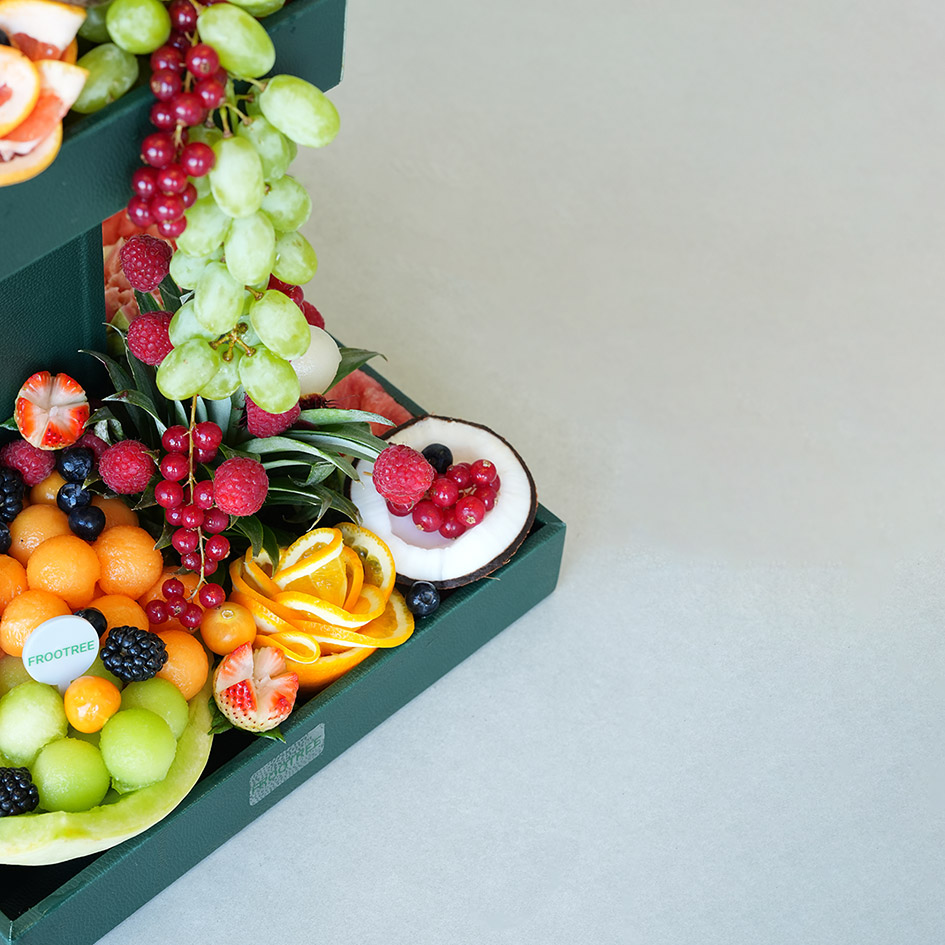 A fruit platter featuring a mix of fruits including blueberries, blackberry, dragon fruit, mango, grapes,watermelon, red current and other seasonal fruits — beautifully arranged in a tray. Some fruits may be replaced by others depending on seasonal availability.