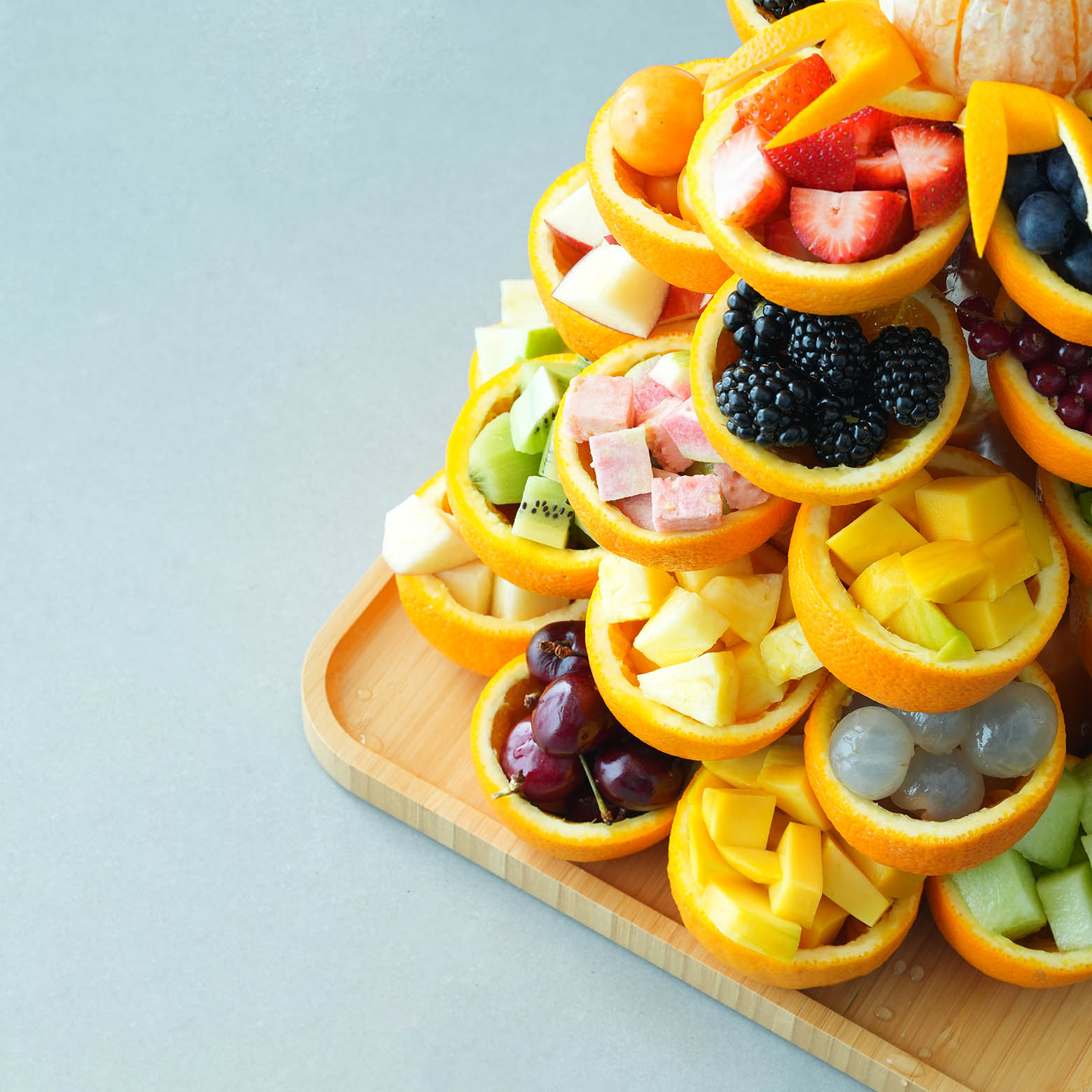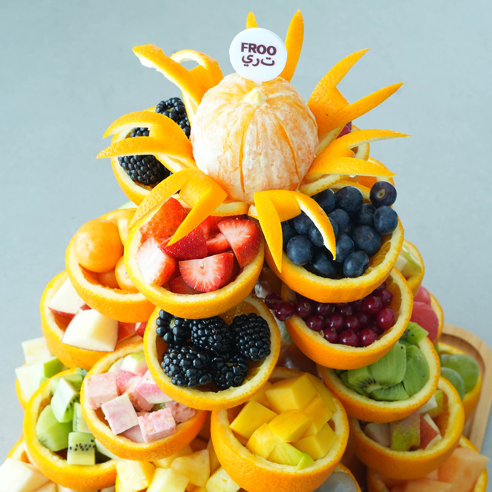 A mix of cut fruits, including Strawberry, Kiwi, Grapes, Raspberry, Bluberry, Melons, Dragon Fruit, Pineapple, Guava, Blackberry, Apple and other mix of Fruits arranged in a Orange Cup.