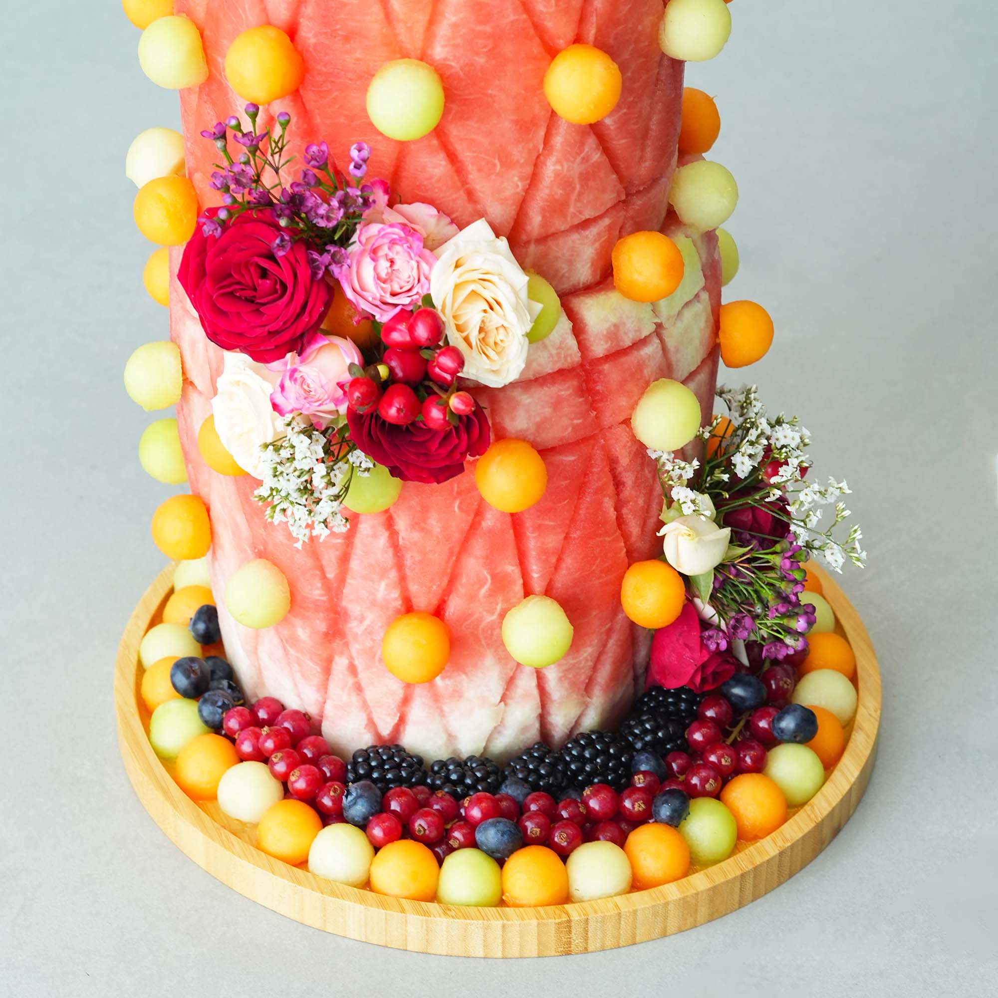 | A mix of cut fruits, including watermelon, Blue Berry, Black Berry, strawberry, Strawberry,redcurrent, melon and other mix of Fruitsand flowers with two tier Water Melon Cake arranged in a wooden tray |